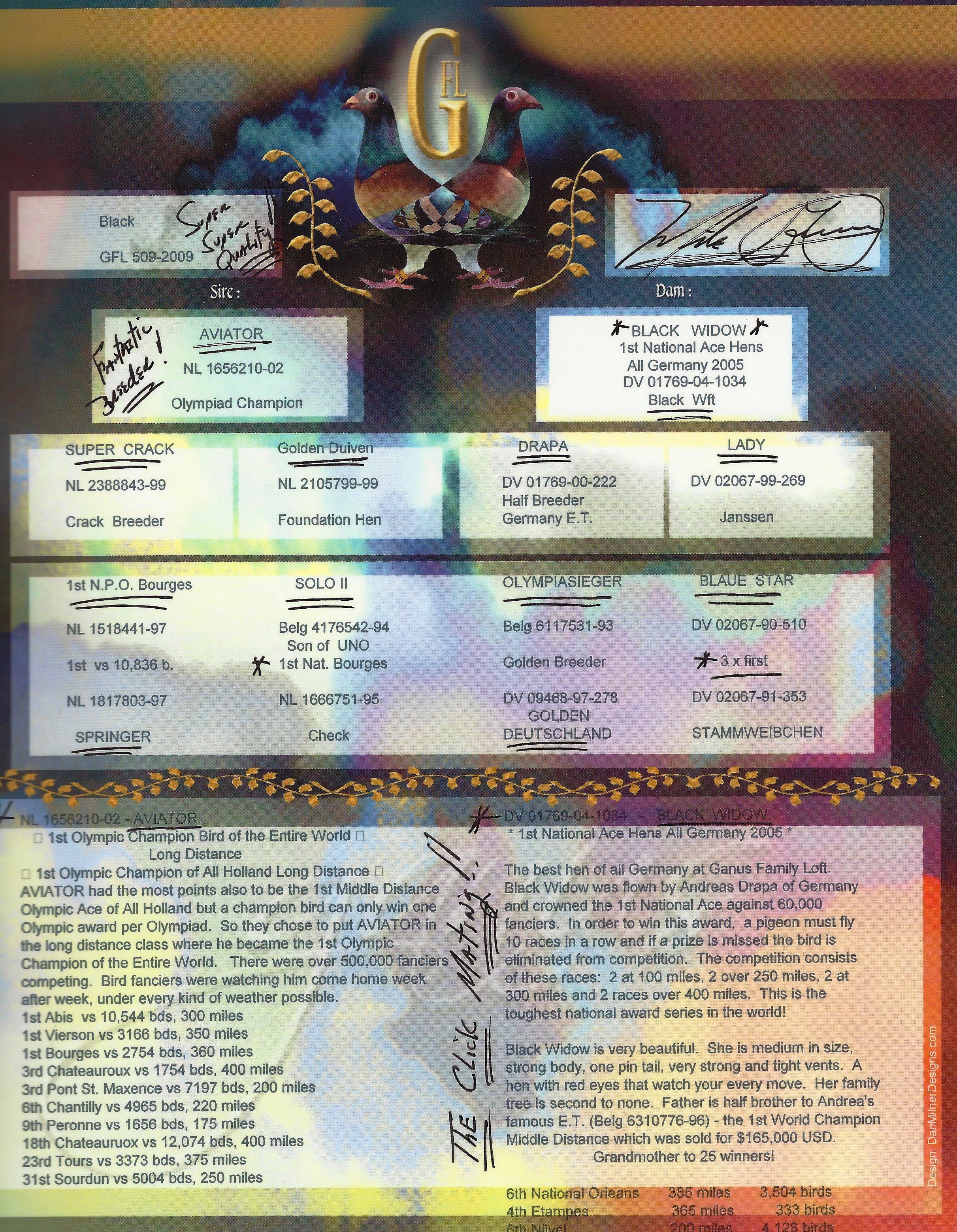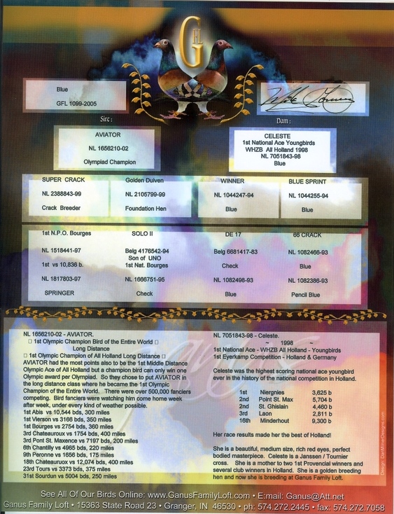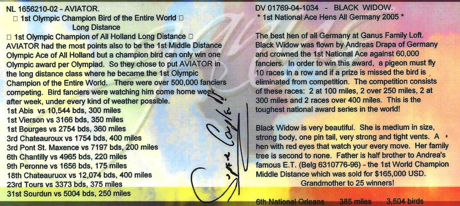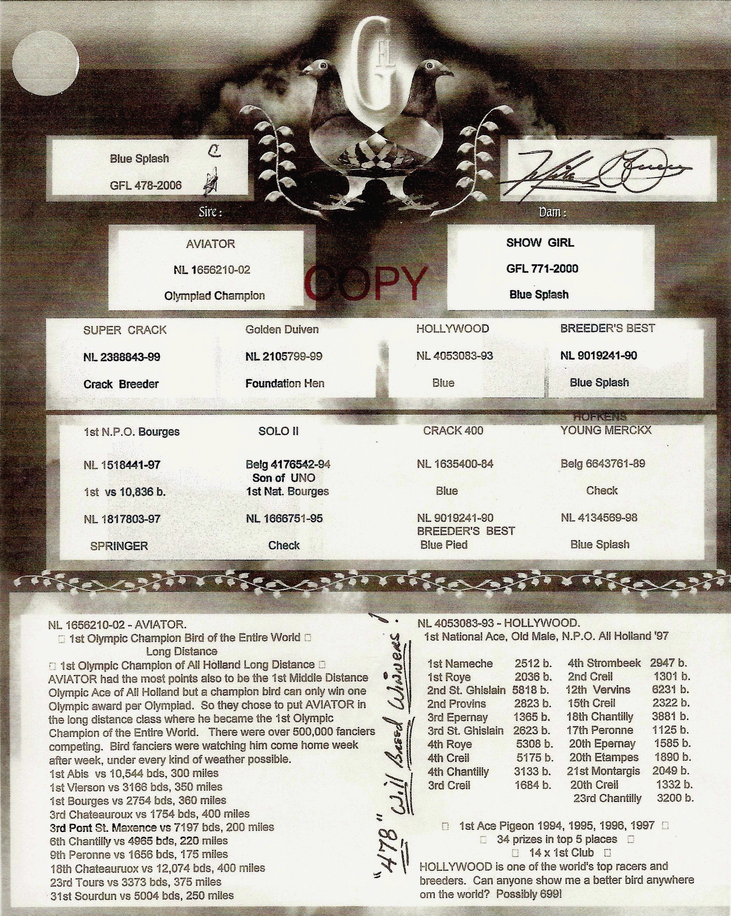 1ST OLYMPIC CHAMPION OF ALL HOLLAND LONG DISTANCE. OLYMPIC ACE OF ALL HOLLAND BUT A CHAMPION BIRD CAN ONLY WIN ONE OLYMPIC AWARD PER OLYMPAID. SO THEY CHOSE TO PUT AVIATOR IN THE LONG DISTANCE CLASS WHERE HE BECAME THE 1ST OLYMPIC CHAMPION IN THE ENTIRE WORLD. THERE WERE OVER 500,000 FANCIERS COMPETING. BIRD FANCIERS WERE WATCHING HIM COME HOME WEEK AFTER WEEK, UNDER EVERY KIND OF WEATHER POSSIBLE.