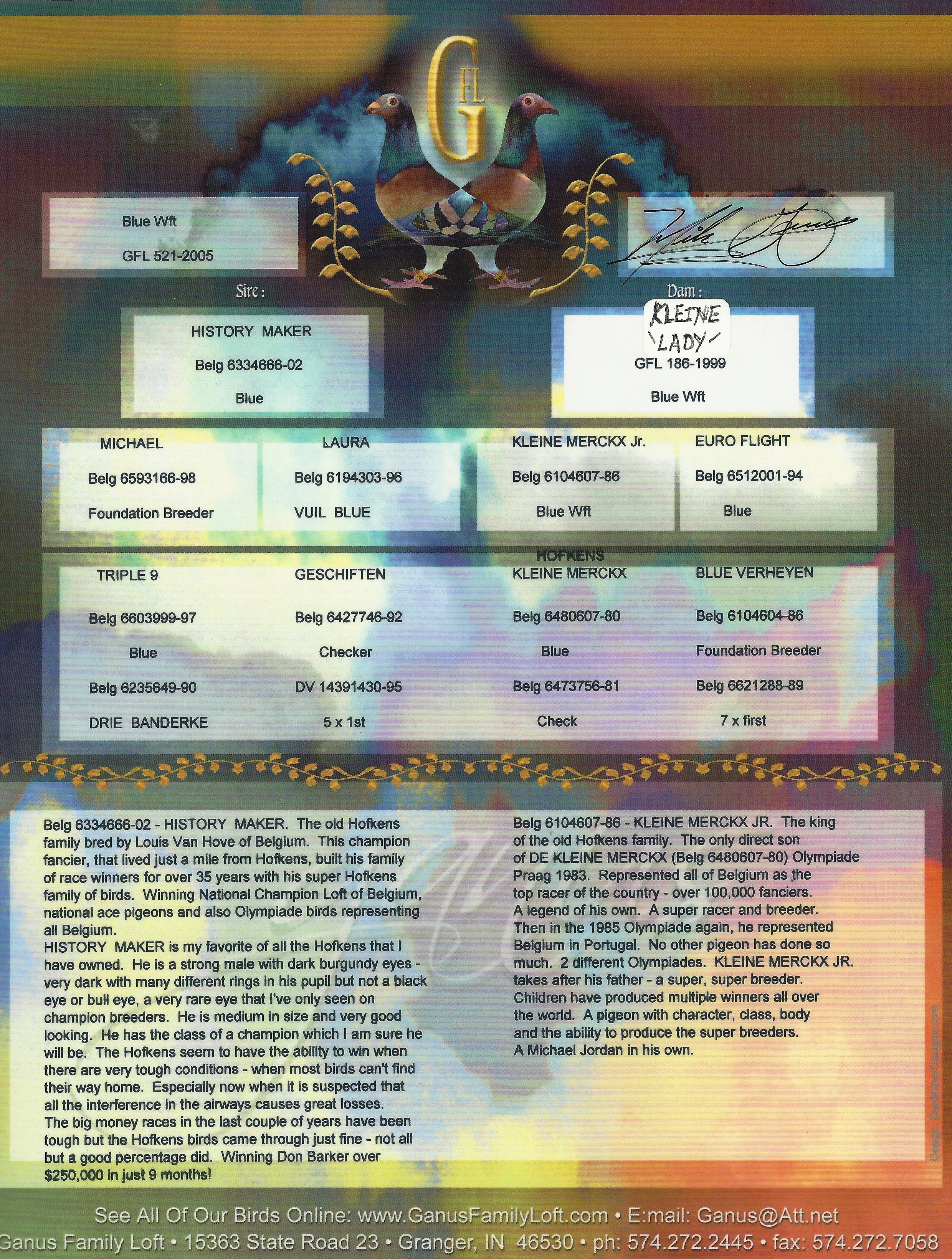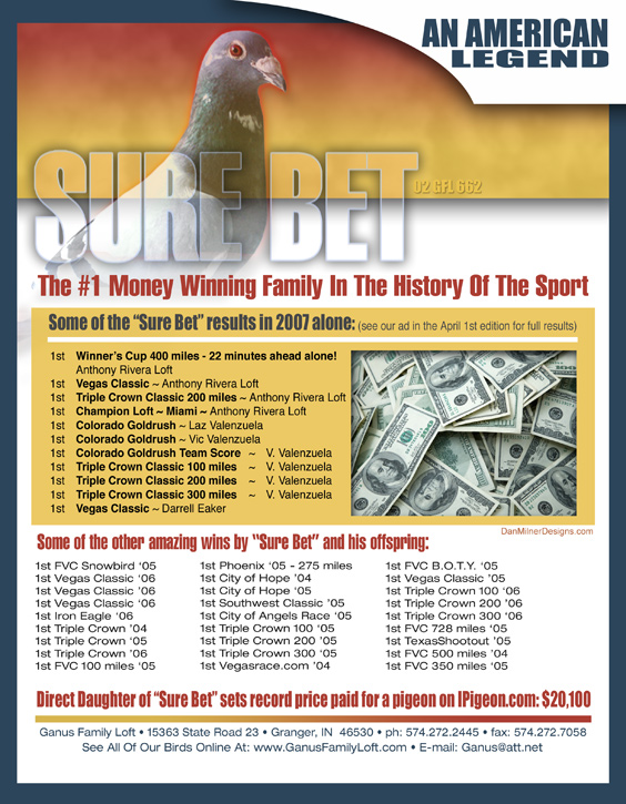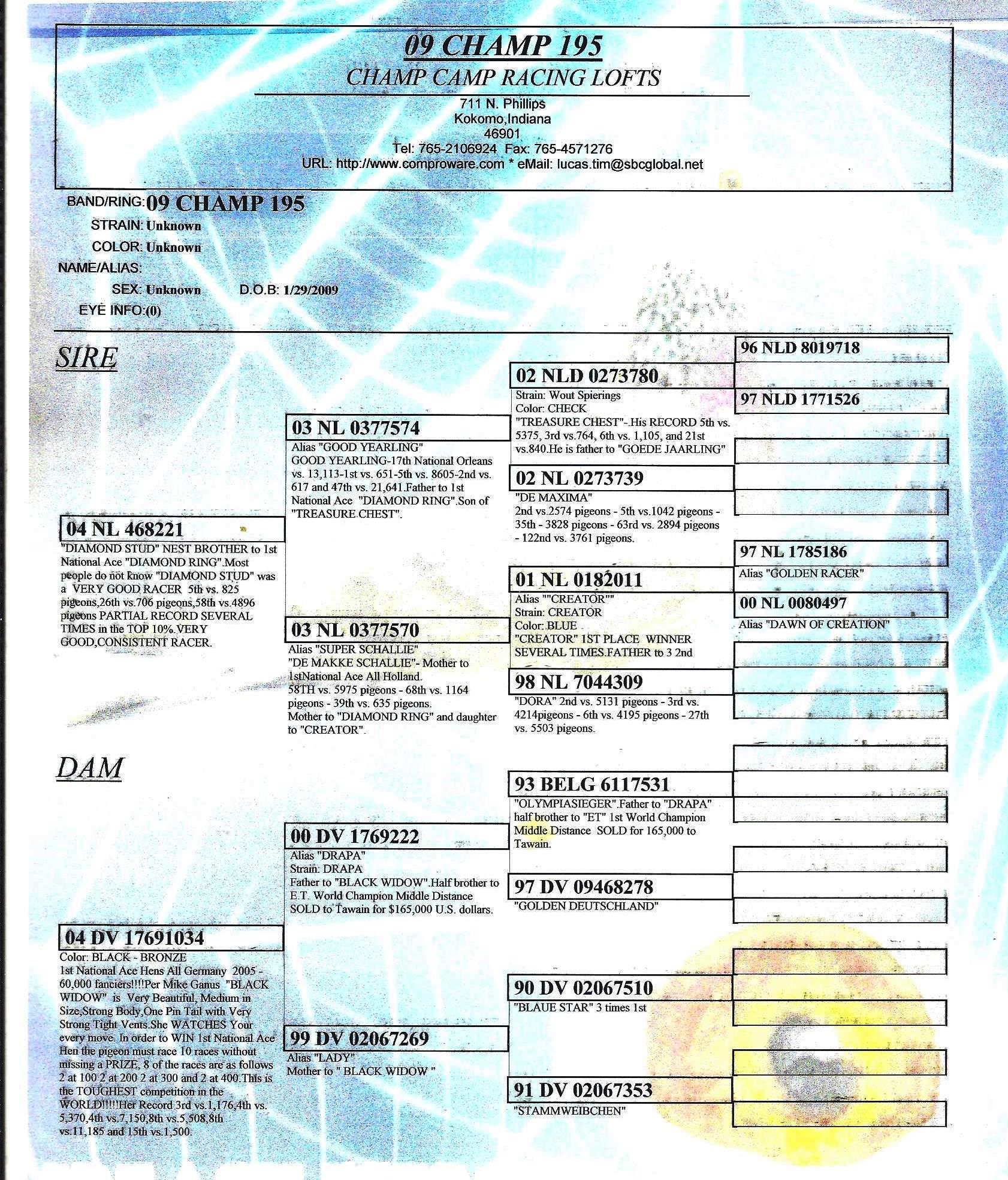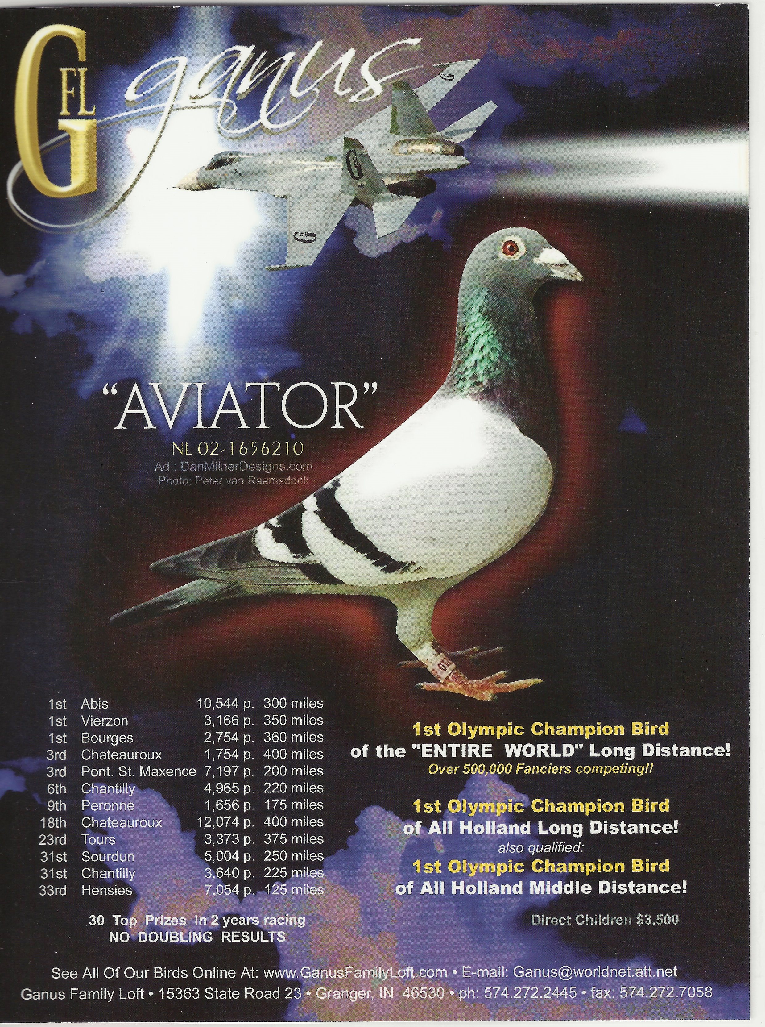 1ST OLYMPIC CHAMPION OF ALL HOLLAND LONG DISTANCE. OLYMPIC ACE OF ALL HOLLAND BUT A CHAMPION BIRD CAN ONLY WIN ONE OLYMPIC AWARD PER OLYMPAID. SO THEY CHOSE TO PUT AVIATOR IN THE LONG DISTANCE CLASS WHERE HE BECAME THE 1ST OLYMPIC CHAMPION IN THE ENTIRE WORLD. THERE WERE OVER 500,000 FANCIERS COMPETING. BIRD FANCIERS WERE WATCHING HIM COME HOME WEEK AFTER WEEK, UNDER EVERY KIND OF WEATHER POSSIBLE.